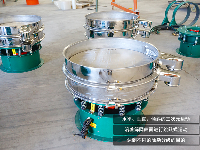 DH系列旋振篩型號齊全產(chǎn)量大,型號分為直徑400mm型、600mm型、800mm型、1000mm型、1200mm型、1500mm型、1800mm型、2000mm型等八種標準機型。篩分分級橡膠粉處理量可達400kg-2T/h,可將物料沿著篩網(wǎng)篩面充分篩分,過網(wǎng)率高篩分精度可達95%。